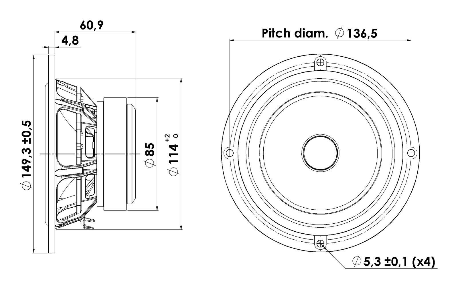 15cm Midrange 4ohm, Coated Fiberglass Cone, Ferrite Magnet
